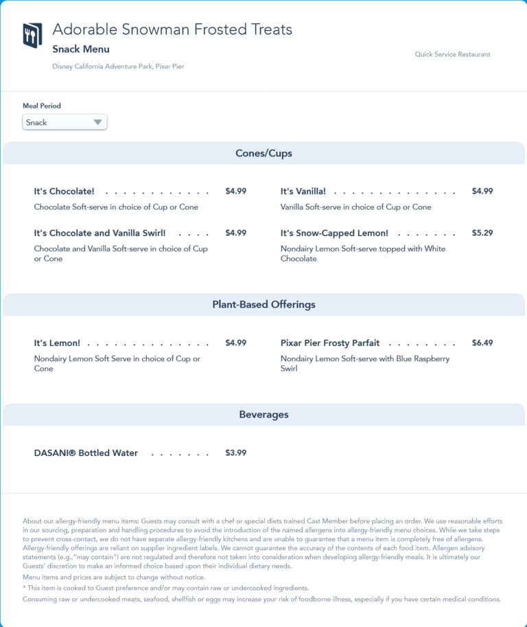 Adorable Snowman Frosted Treats reopening menu from April 30th, 2021. This menu was replaced by an updated menu in August 2021 that removed all chocolate and vanilla soft-service items, including It's Chocolate and It's Vanilla.