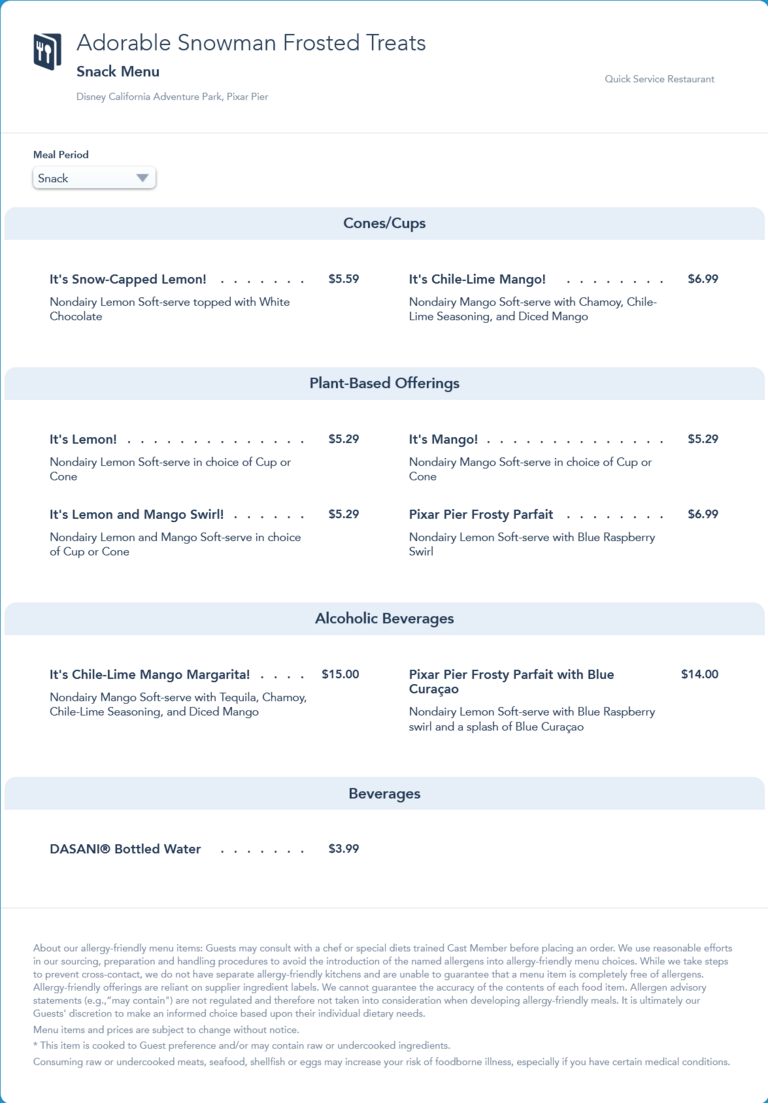 This menu was replaced by an updated snack menu in October 2022 that included price increases to all menu items and added the fall seasonal Mike Wazowski Pumpkin Bottle Topper.