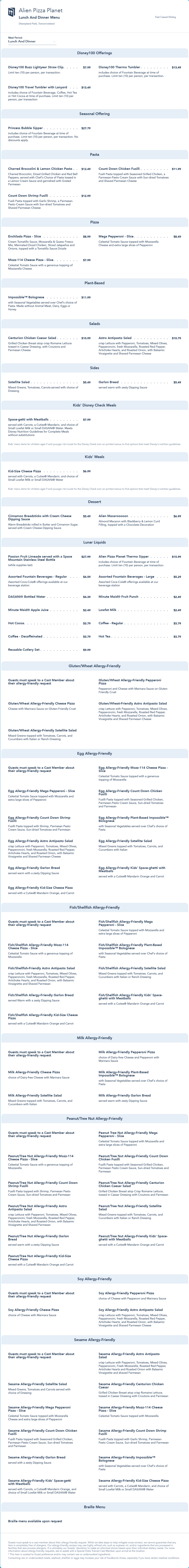 Alien Pizza Planet Lunch/Dinner Menu - August 2023