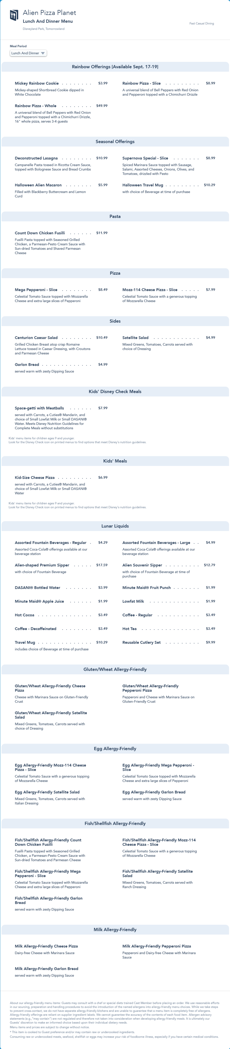 Alien Pizza Planet Lunch/Dinner Menu - Gay Days 2021