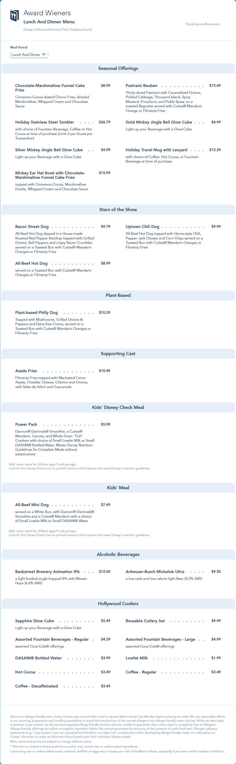 updated lunch/dinner menu in July 2022 that returned the Filmstrip Fries to the menu and added the following summer seasonal items: