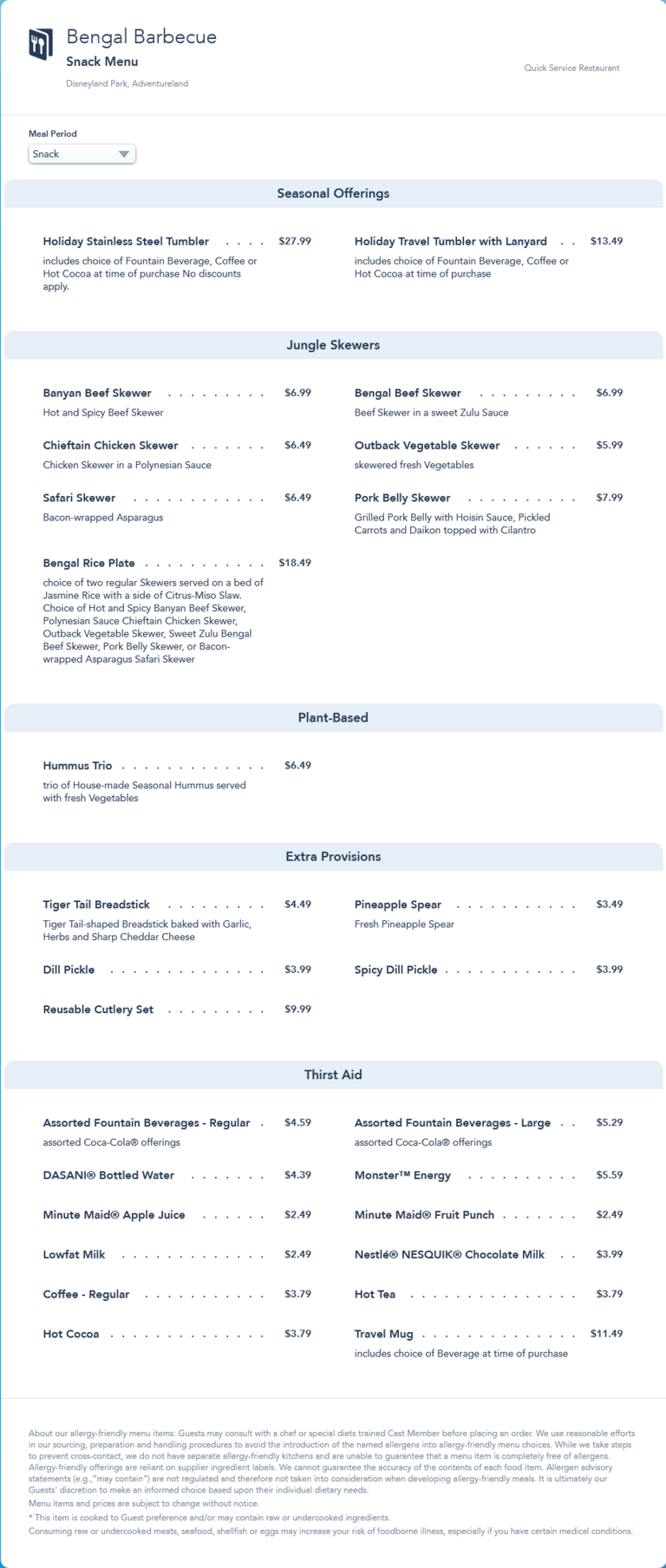 This menu was replaced by an updated snack menu in August 2023 that added the Disney100 Stainless Steel Tumbler.