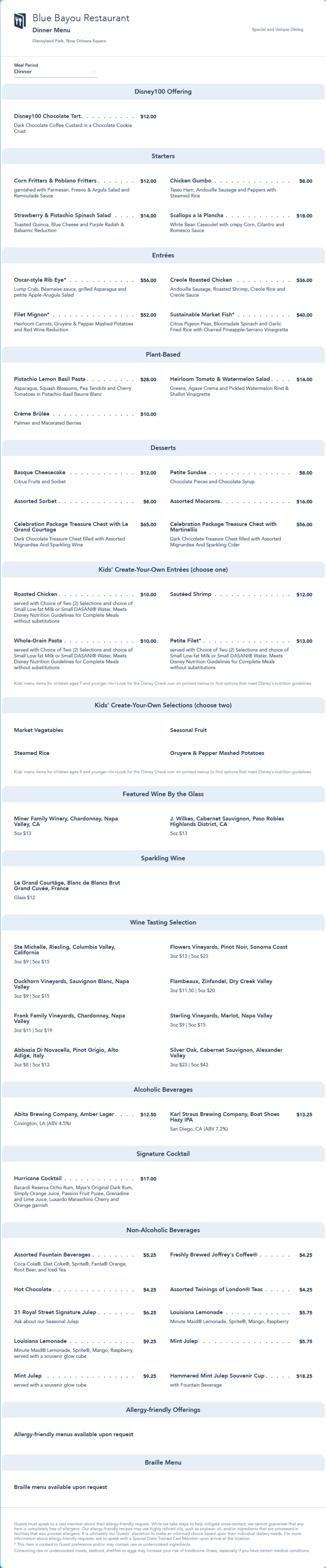 Blue Bayou Restaurant Dinner Menu - August 2023