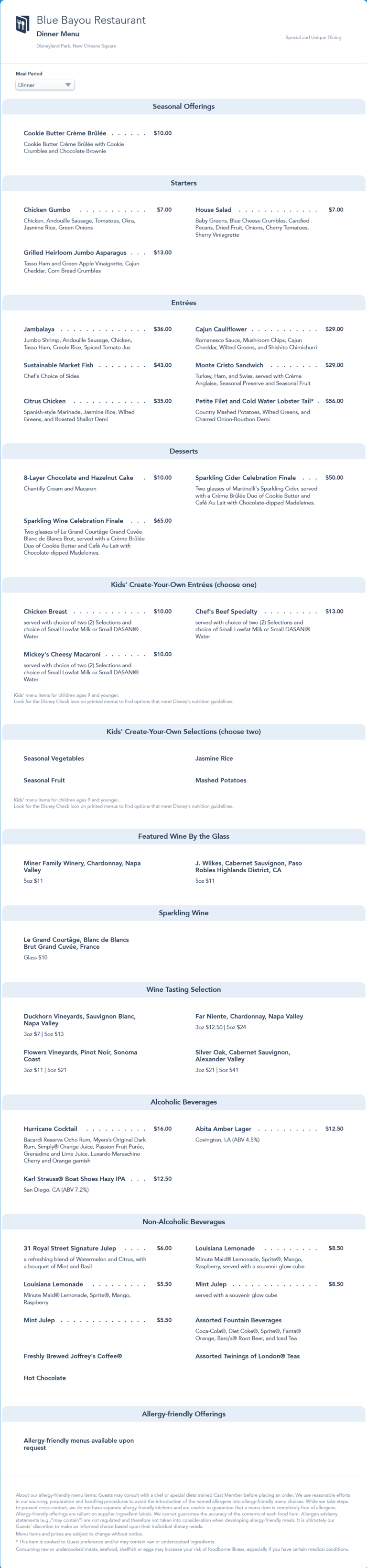 updated dinner menu in July 2022 that: