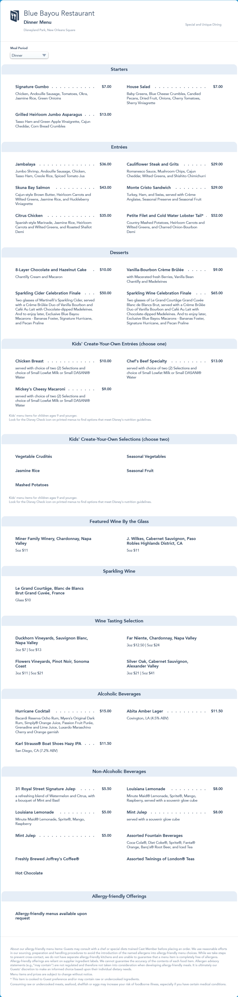 updated dinner menu in November 2021 that changed the desserts, added the seasonal Cookie Butter Creme Brulee and Thanksgiving Day-only offerings.