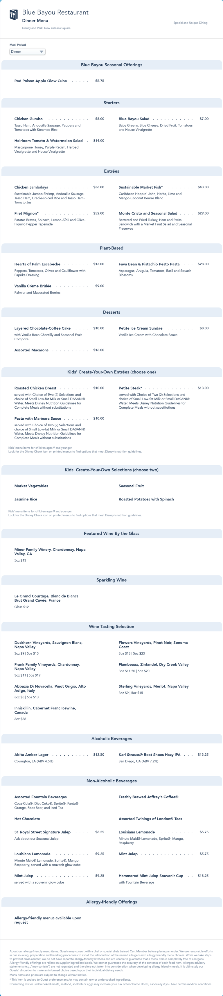 Fall 2022 Dinner menu. This menu increased the price of the Chicken Gumbo from $7 to $8 and added the Assorted Macarons Dessert and Red Poison Apple Glow Cube.