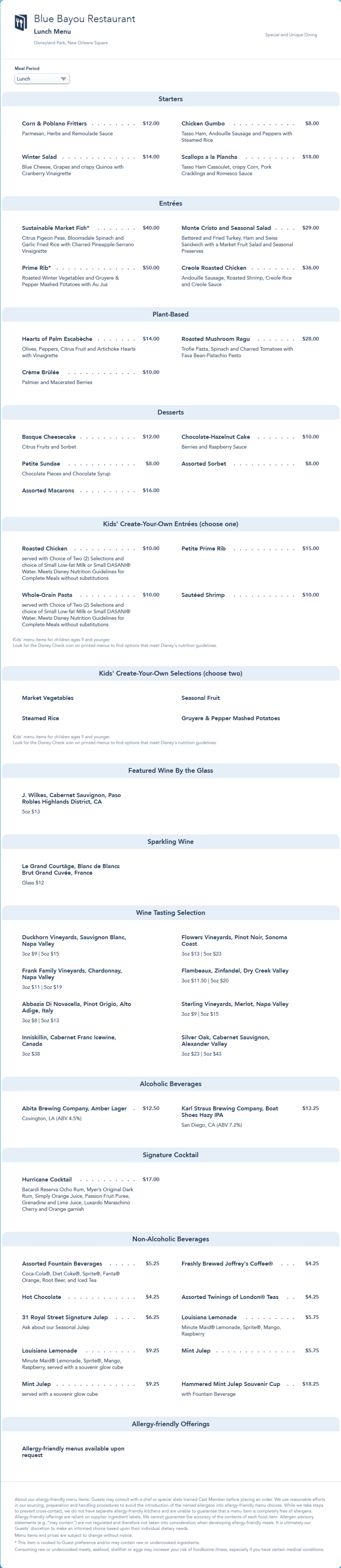 Blue Bayou Restaurant Lunch Menu - December 2022 (archived)
