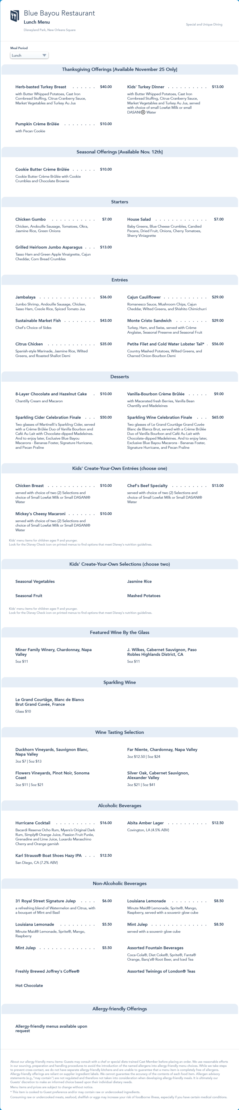 Blue Bayou Restaurant Lunch Menu - November 2021 (archived)