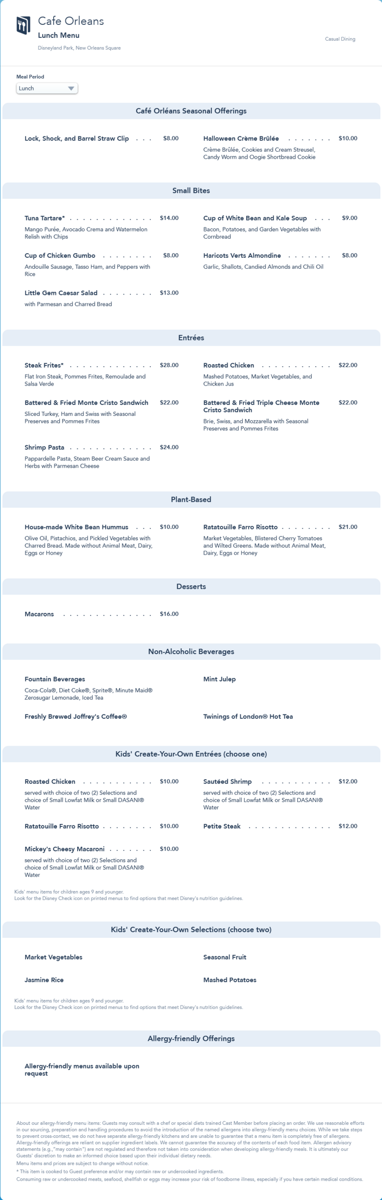 Fall 2022 Lunch menu. This menu included $1 price increases to most Starter and Entrees, added the Kids' Entrees section and Fall seasonal items.