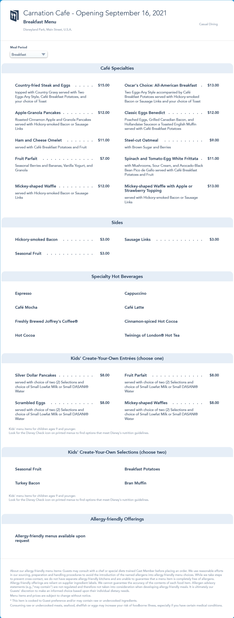 Initial Carnation Cafe reopening breakfast menu. This menu was replaced by an
