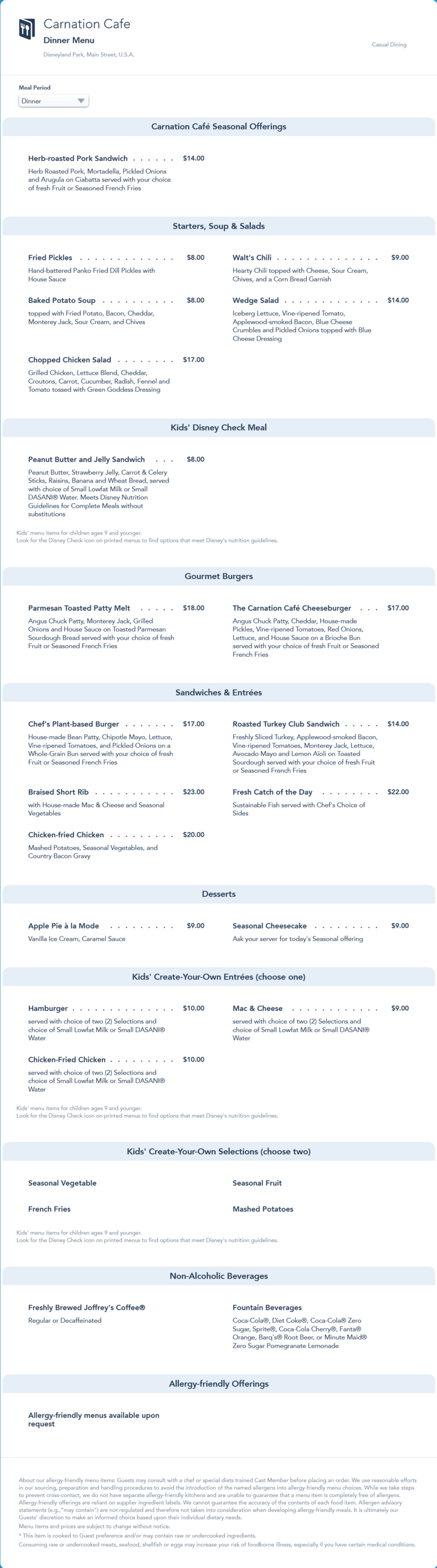 This menu was replaced by an updated dinner menu in July 2022 that removed the winter seasonal Herb-roasted Pork Sandwich and increased the price of the Roasted Turkey Club Sandwich by $1, from $14 to $15.