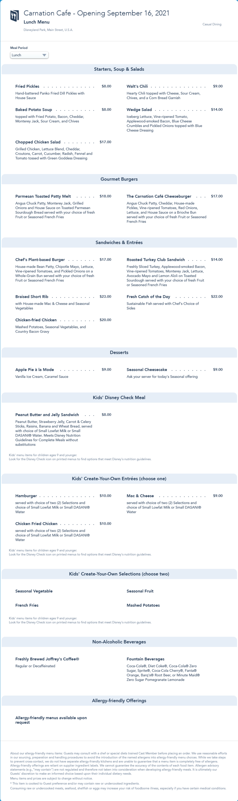 updated lunch menu in November 2021 that added the seasonal Herb-roasted Pork Sandwich and Thanksgiving Day-only Turkey Dinner and Classic Pumpkin Pie.
