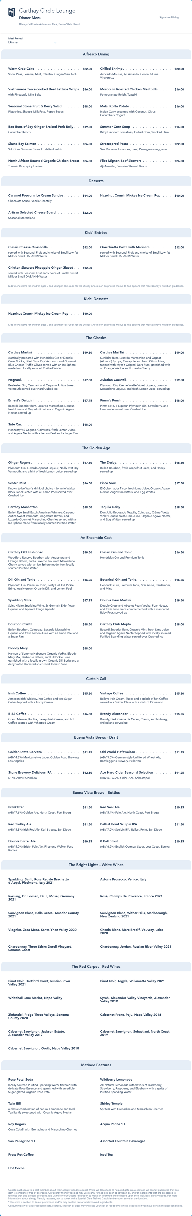 Carthay Circle Lounge Dinner Menu - August 2023