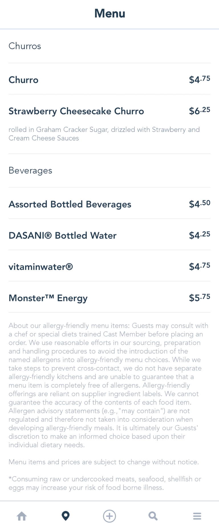 This menu was replaced by an updated menu in September 2021 that replaced the Strawberry Cheesecake Churro with the Halloween seasonal Chocolate-Marshmallow Churro and increased the price of the standard Churro and some Beverages.