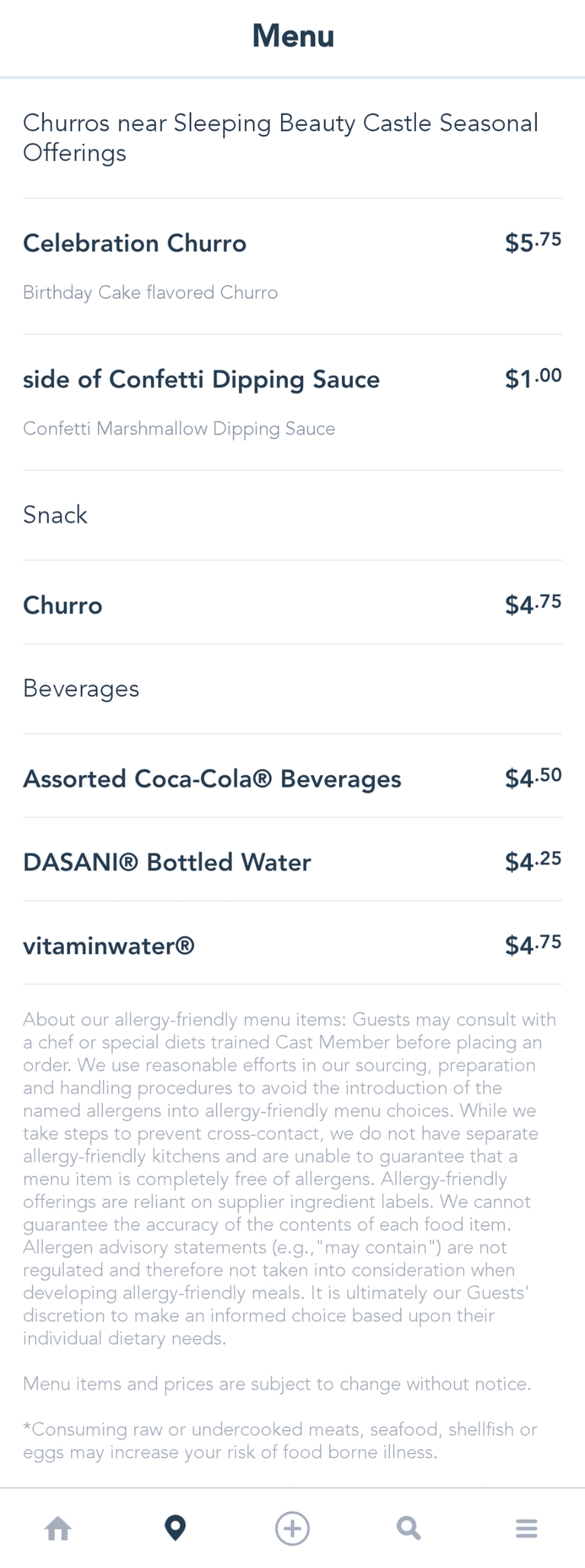 Churros near Sleeping Beauty Castle Snack Menu - July 2021 (archived)