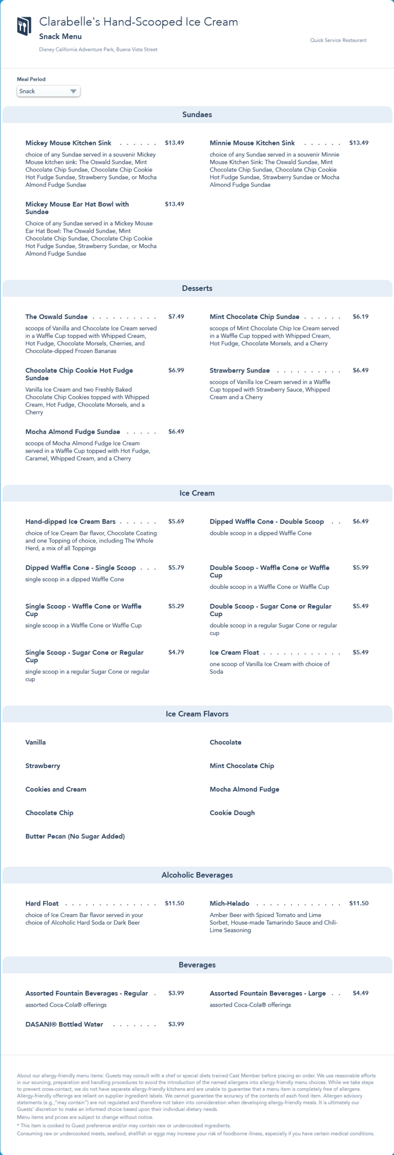 Clarabelle's Hand-Scooped Ice Cream Snack Menu - July 2021 (archived)
