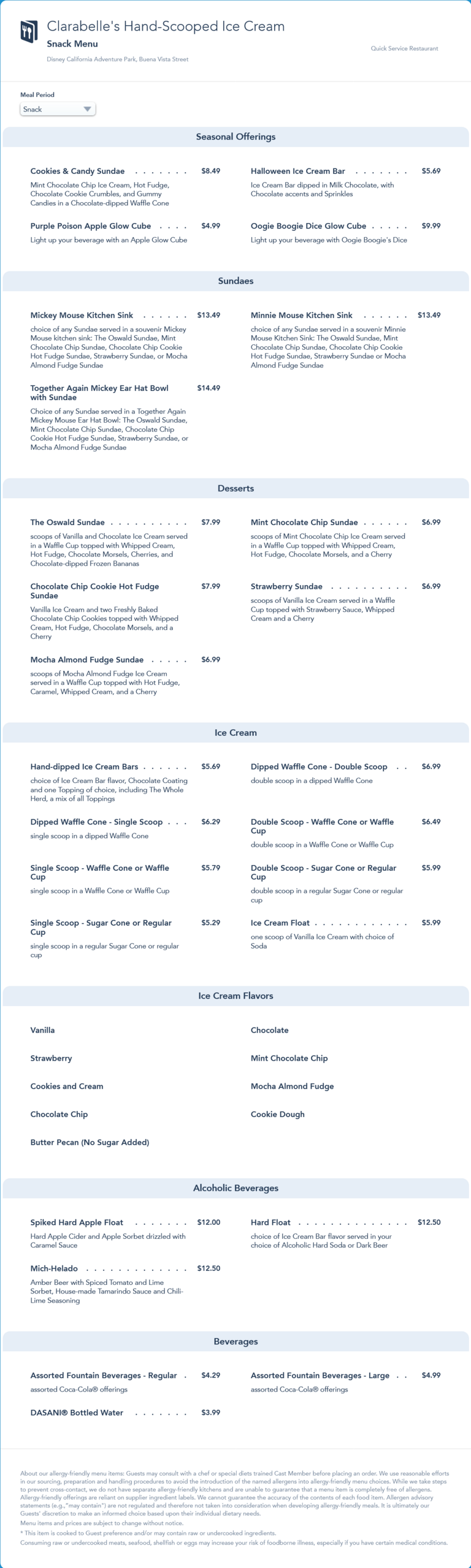 This menu was replaced by an updated menu in November 2021 that added Christmas seasonal items, replaced the Spiked Hard Apple Float with the Tres Leches Hard Float and increased the price of the Together Again Mickey Ear Hat Bowl with Sundae $1, from $14.49 to $15.49.