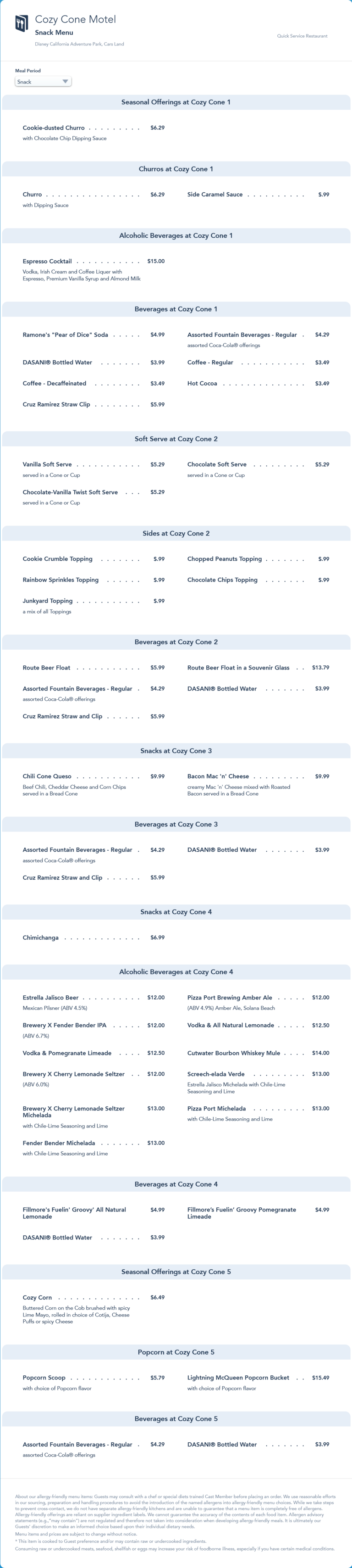 Cozy Cone Motel Snack Menu - May 2022