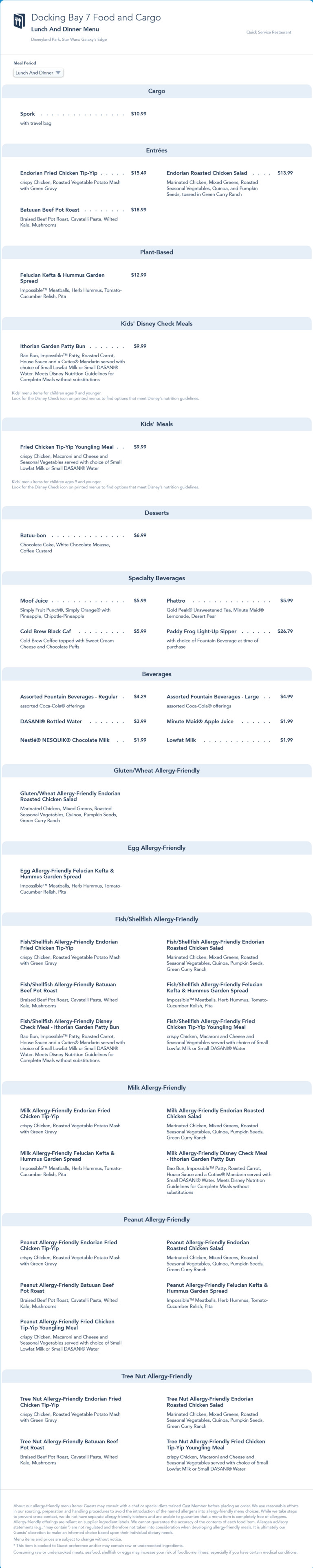 This menu was replaced by an updated lunch/dinner menu in January 2022 that added the Dewback Chili Noodles.