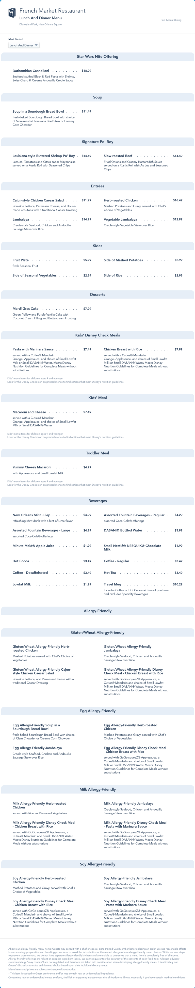 French Market Restaurant Lunch/Dinner Menu - Star Wars Nites 2022 (archived)