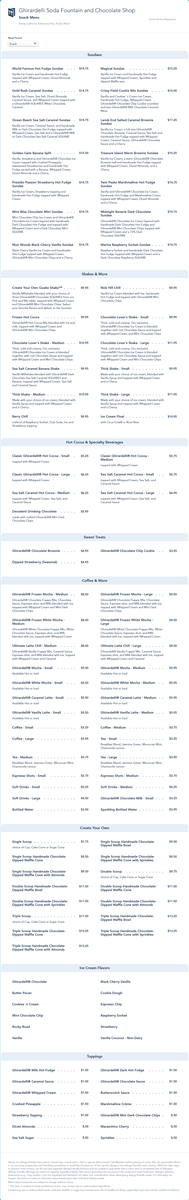 Ghirardelli Soda Fountain and Chocolate Shop Snack Menu - July 2022