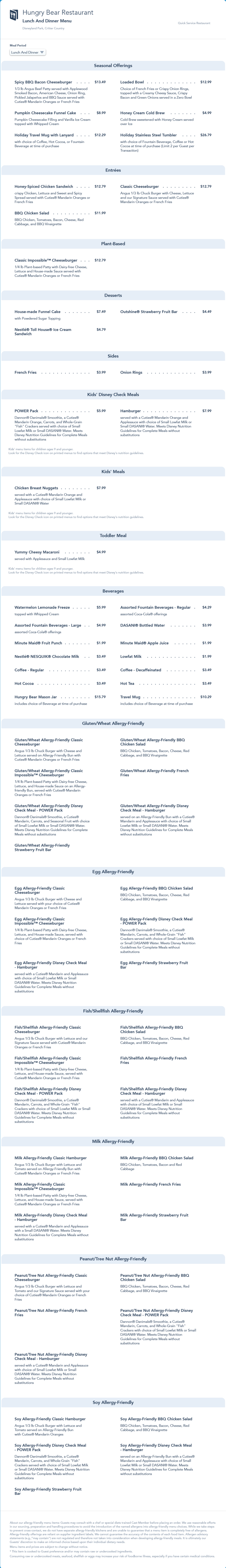 updated lunch/dinner menu that removed the remaining Christmas seasonal items and added the Winter 2022 seasonal Snickerdoodle Cold Brew and Red Velvet Funnel Cake.