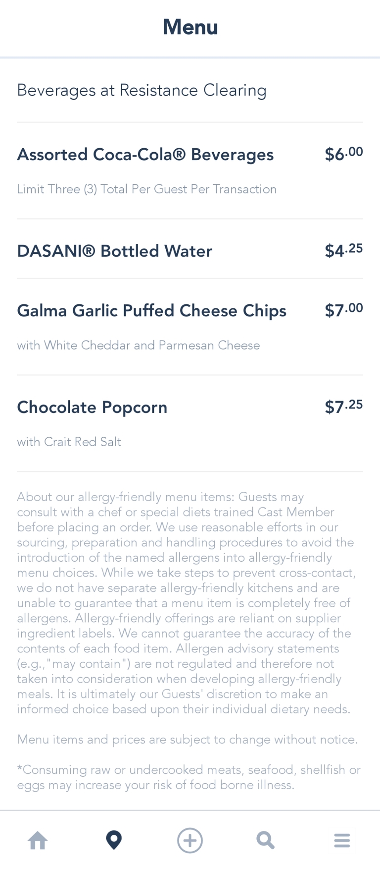 This menu was replaced by an updated menu in May 2022 that added the Sullust Garlic Chips and increased the price of the Galma Garlic Puffed Cheese Chips from $7.00 to $7.25.