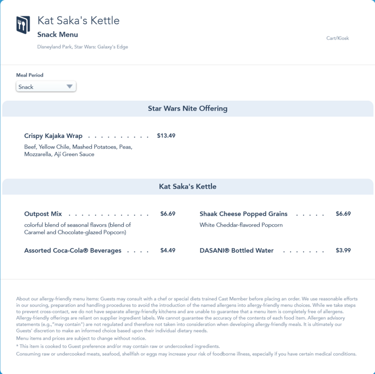 Kat Saka's Kettle Snack Menu - Star Wars Nites 2022