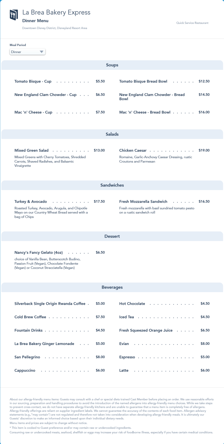 La Brea Bakery Express Dinner Menu - January 2022