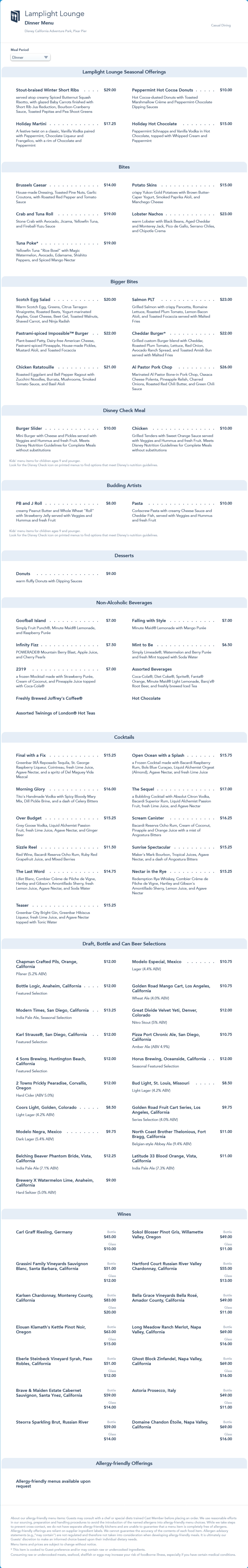Winter seasonal menu that included price increases to Beverages ($.50), Cocktails ($1), Beer ($.50-$1), Bites (varied) and a price decrease on PB and J roll ($2).
