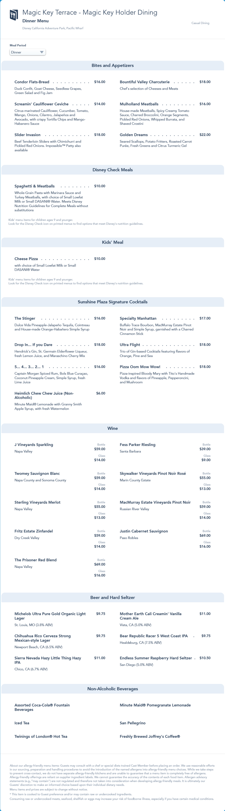 updated dinner menu in May 2022 that added the seasonal Golden State Pork Loin and Avalon Cooler offerings. It also added the Athletic Brewing, Run Wild Non-Alcoholic IPA.