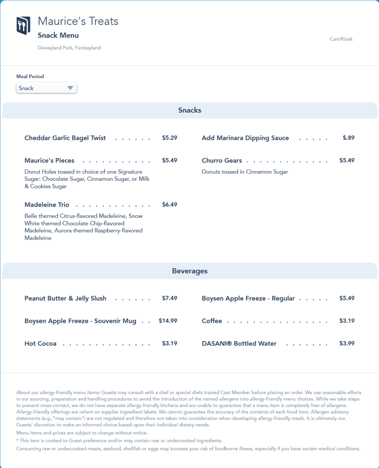 Maurice's Treats Snack Menu - August 2021