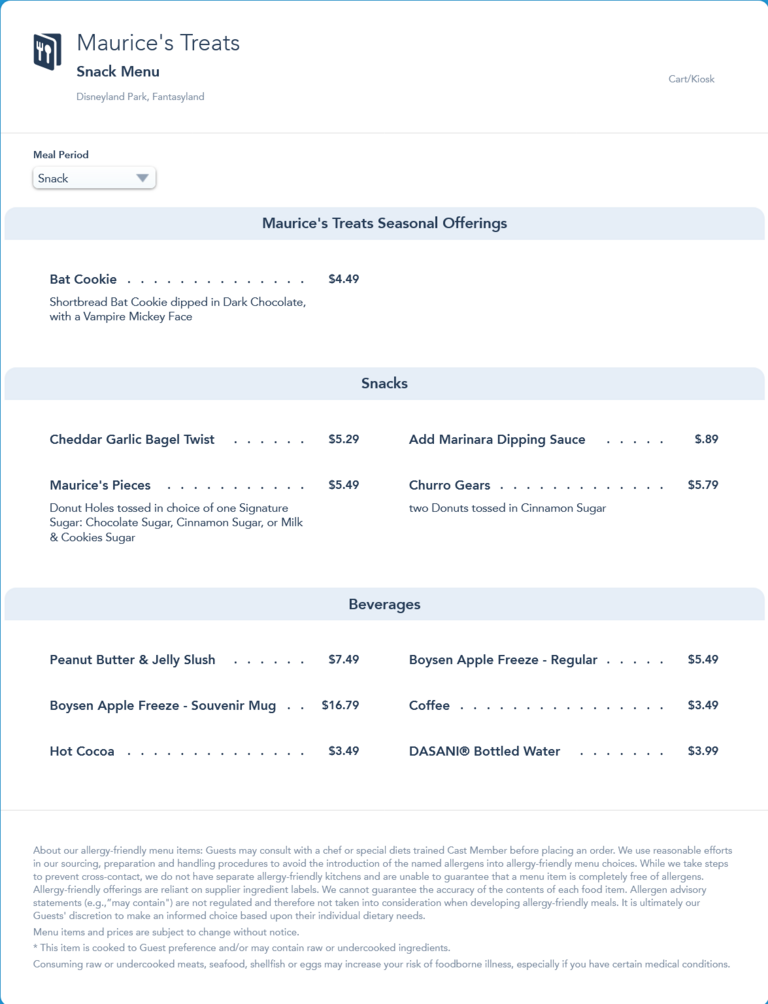 This menu was replaced by an updated menu in November 2021 that removed the Halloween seasonal Bat Cookie.