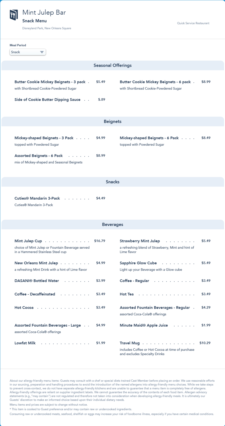 This menu was replaced by an updated menu in May 2022 that removed the winter seasonal Butter Cookie Mickey Beignets and added the spring seasonal Banana Beignets and Passion Fruit Mint Julep.