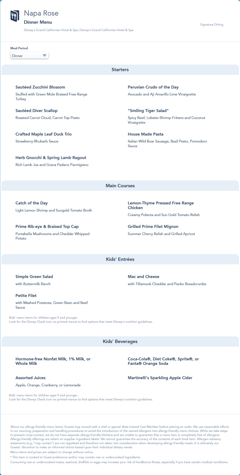 Napa Rose Dinner Menu - July 2022