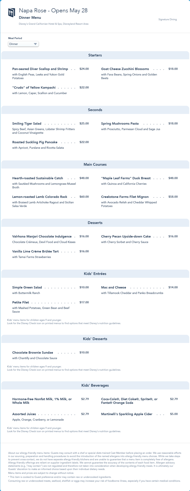 Napa Rose's reopening dinner menu from May 28th, 2021. It was replaced by the