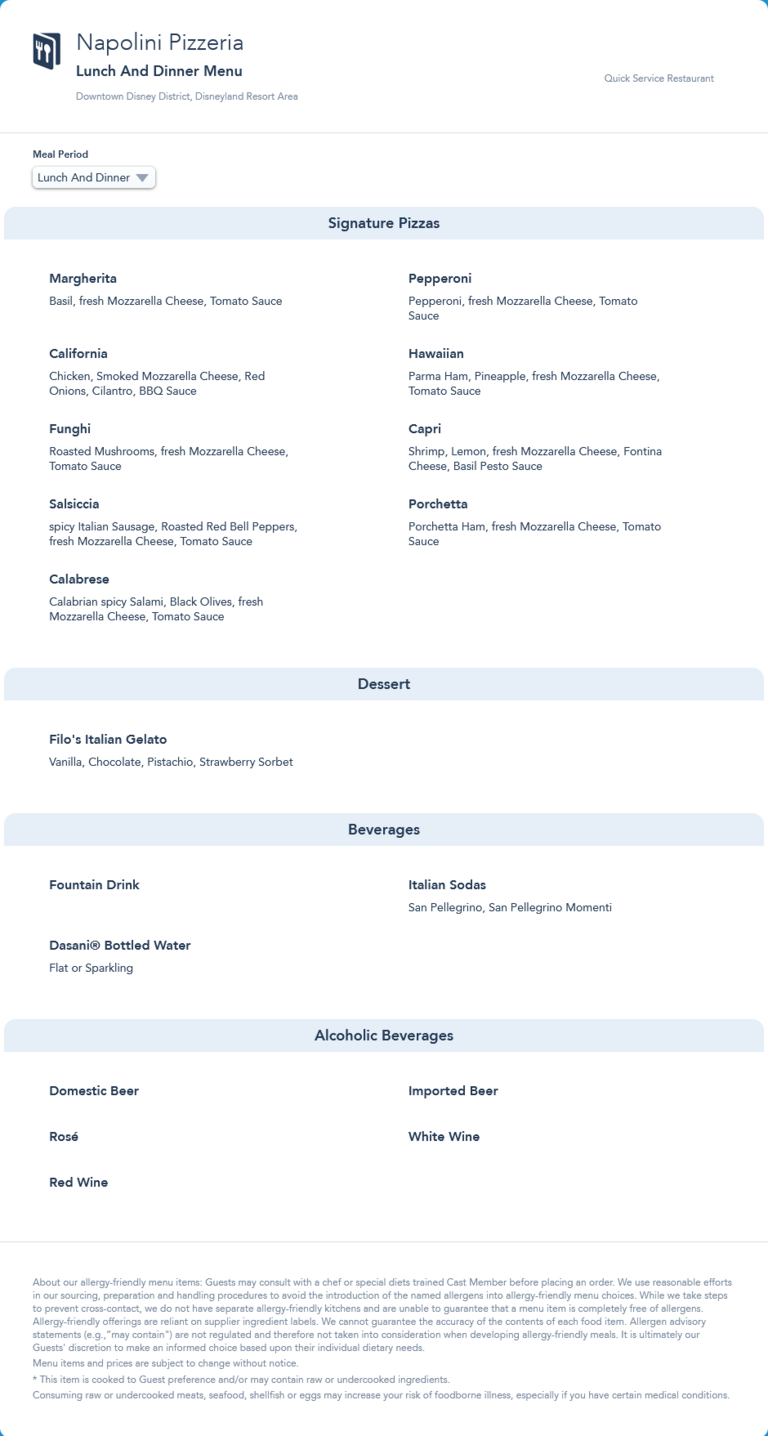 Napolini Pizzeria Lunch/Dinner Menu - May 2021