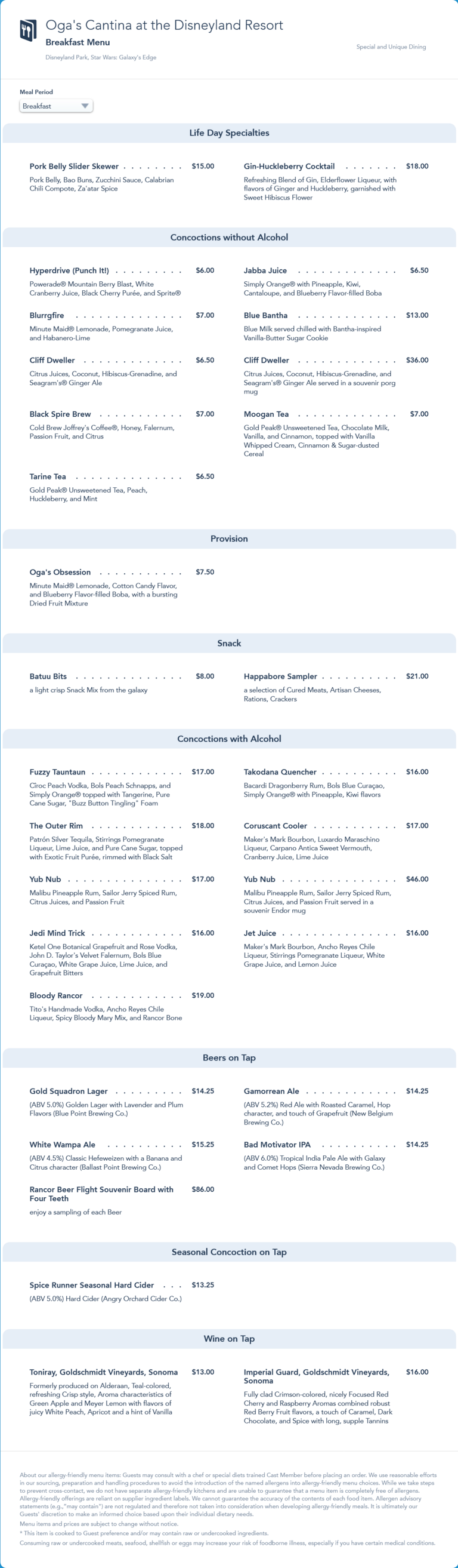 updated breakfast menu in January 2022 that removed the Fuzzy Tauntaun cocktail.