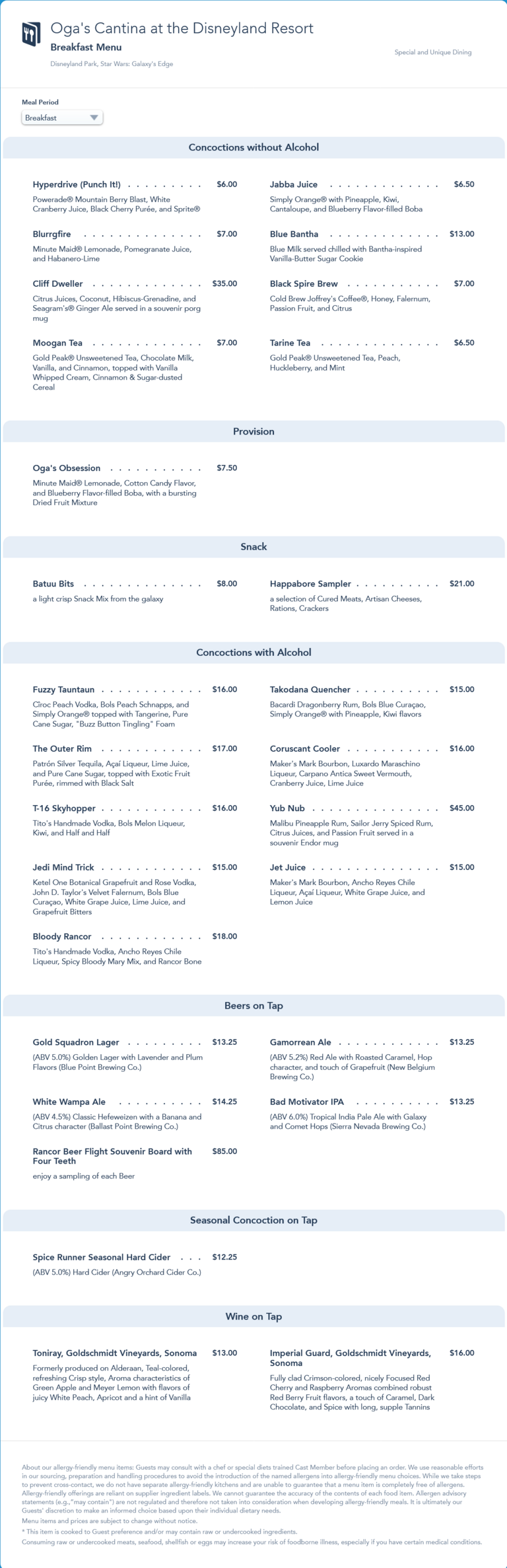 This menu was replaced by an updated breakfast menu in November 2021 that includes a $1 price increase for all Cocktails, Draft Beer and the Cliff Dweller Souvenir Mug.