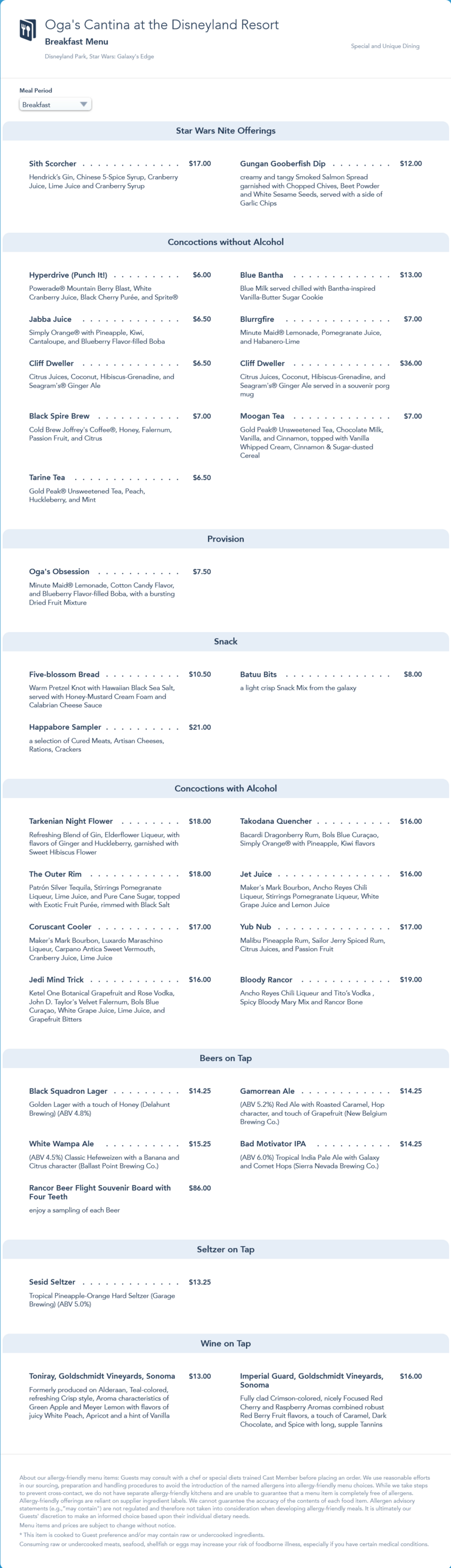 Oga's Cantina Breakfast Menu - Star Wars Nites 2022