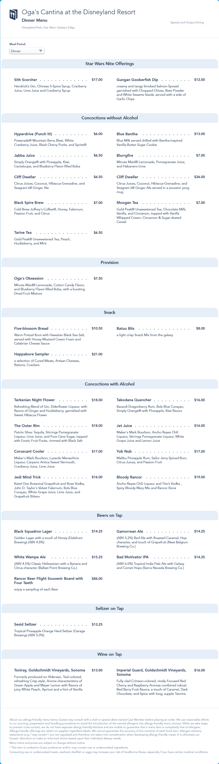 Oga's Cantina Dinner Menu - Star Wars Nites 2022