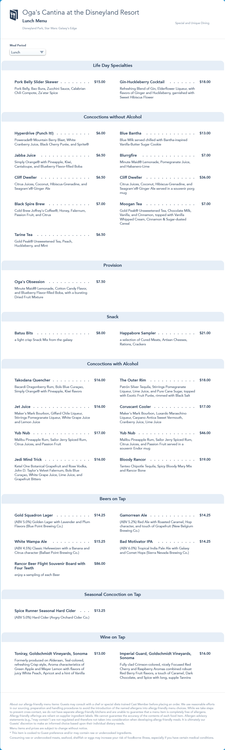 Lunch menu from January 2022 that removed the Fuzzy Tauntaun drink.