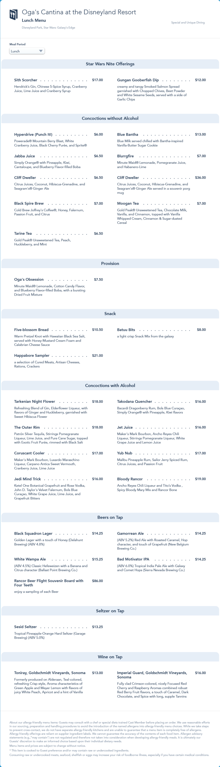 Oga's Cantina Lunch Menu - Star Wars Nites 2022