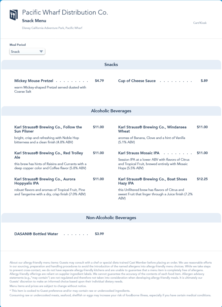 updated menu in September 2021 that added the Cream Cheese-filled Pretzel and Jalapeno Cheese-filled Pretzel. It also replaced the Karl Strauss Mosaic IPA with the Halloween seasonal Karl Strauss Oktoberfest.