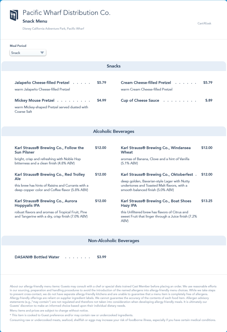 This menu was replaced by an updated menu in November 2021 that removed the Jalapeno and Cream Cheese-filled Pretzels and replaced the Karl Strauss Oktoberfest Ale with the Karl Strauss Golden Stout.