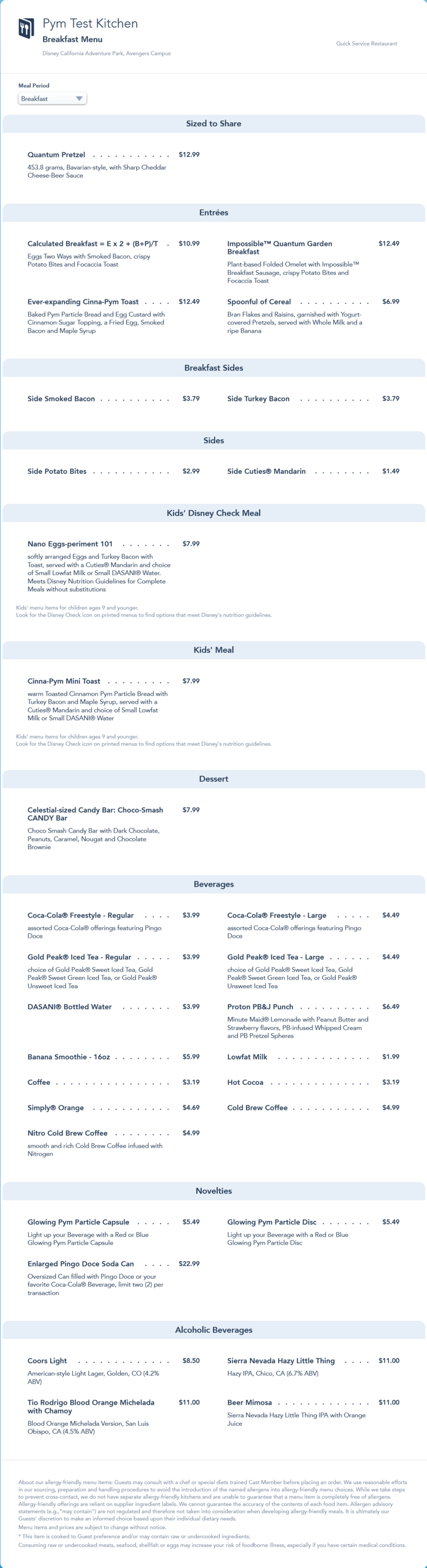 Initial breakfast menu, added in July 2021. This menu was replaced by an updated menu in September 2021 that removed the Spoonful of Cereal and increased the price of Alcoholic Beverages by $1.00.