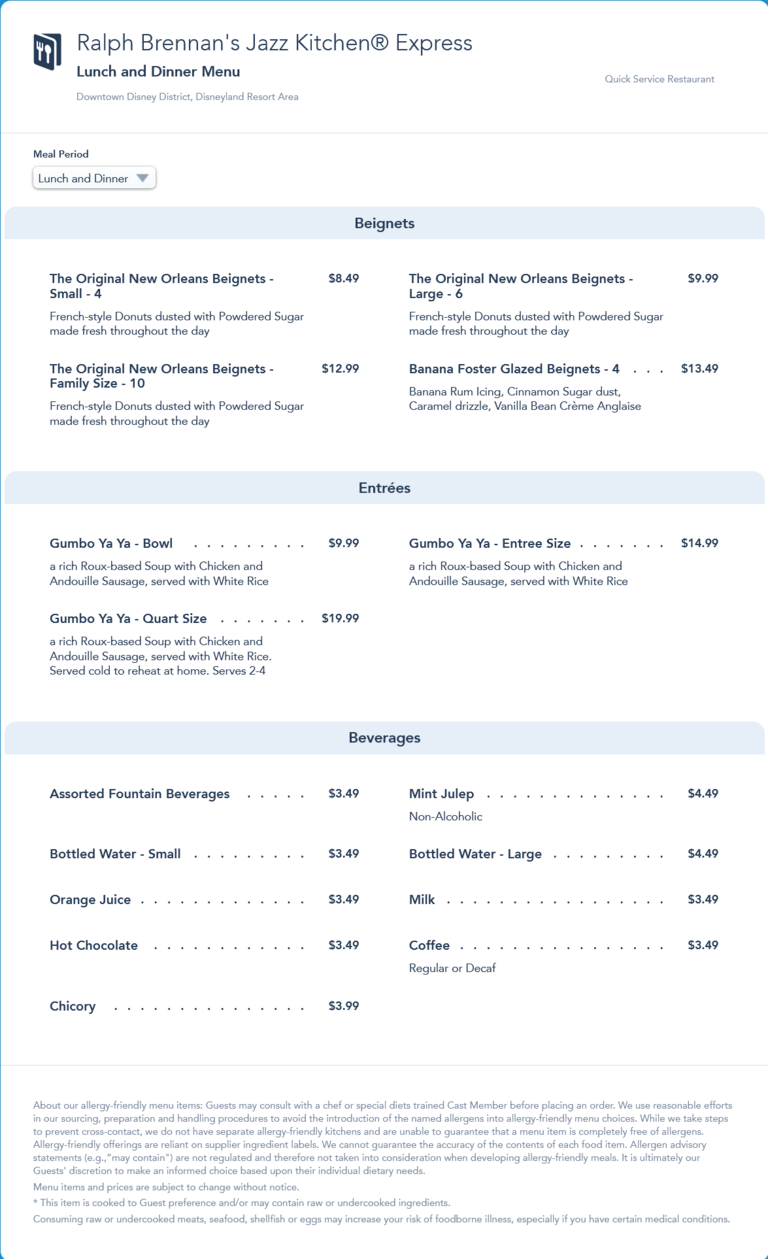 Ralph Brennan's Jazz Kitchen Express reopening Menu from April 30th, 2021. It was replaced by an updated menu in July 2021 that increased the price of all Beignets by $1.00 and removed the larger sizes of Gumbo Ya-Ya.