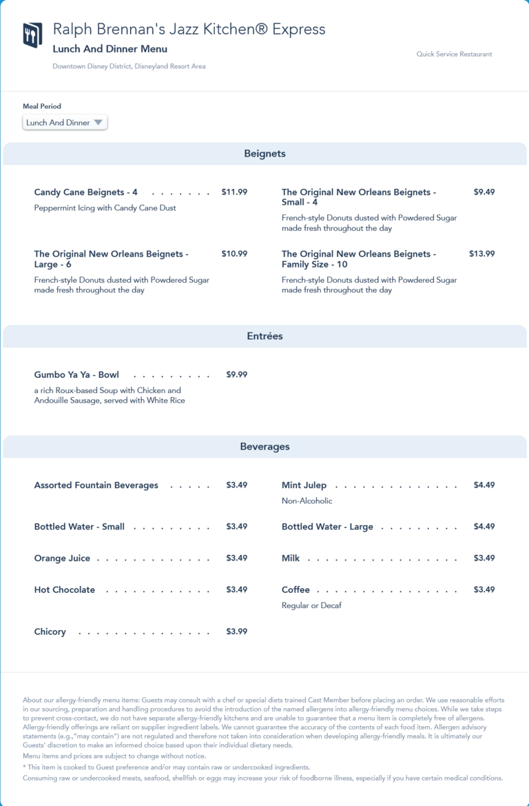 Ralph Brennan's Jazz Kitchen Express Lunch/Dinner Menu - January 2022