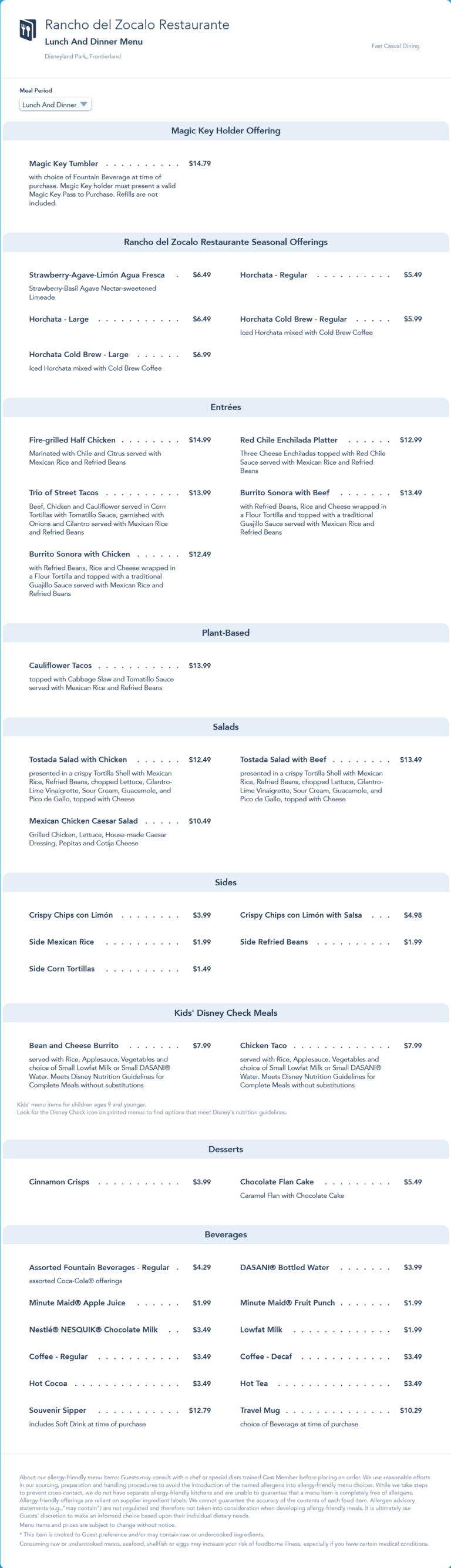 Rancho del Zocalo Restaurante Lunch/Dinner Menu - July 2022