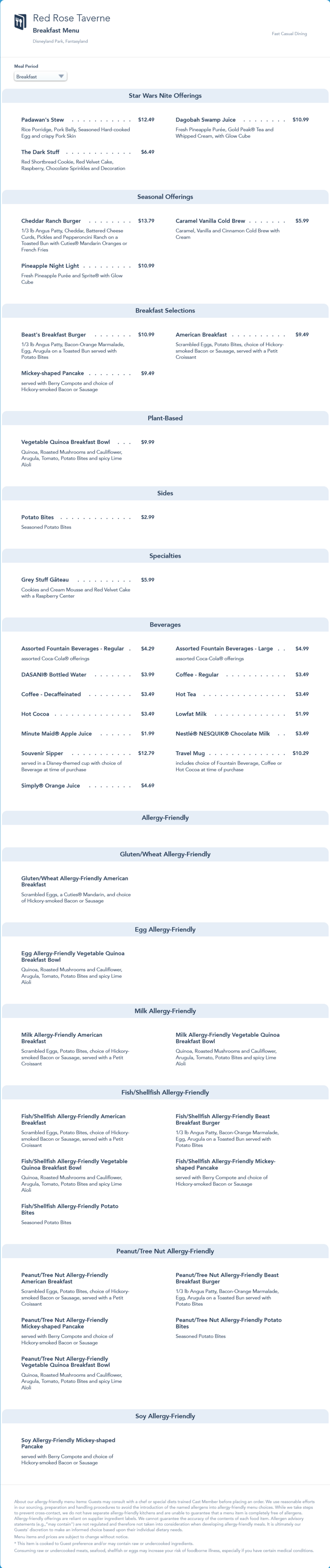Red Rose Taverne Breakfast Menu - Star Wars Nites 2022
